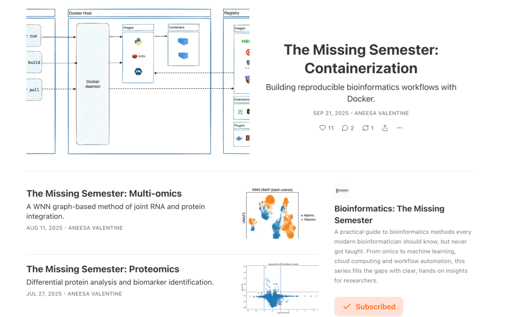 The Missing Semester is a Substack series intended to teach the fundamentals of bioinformatics; from modality-specific data analysis to containerization and foundation models in genomics, the series builds from individual analyses to R&D-team scale, equipping learners with practical toolsets for starting and navigating bioinformatics in an industry setting.